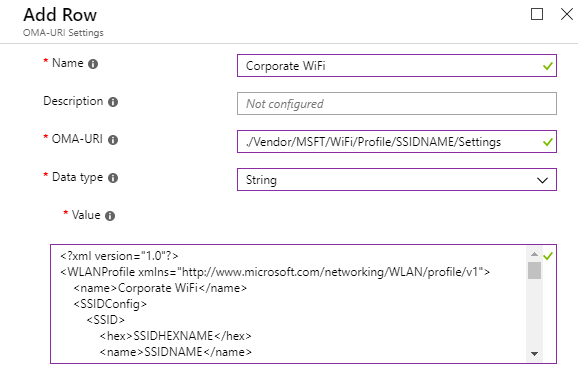 1. SSIDNAME: Replace “SSIDNAME” with your broadcast SSID in the OMA-URI setting above and in XML text ( Line7 ).